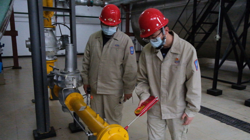 图为11月6日,北京热力集团丰台分公司西马锅炉房内,工作人员手持仪器对锅炉管线的各点位进行检查。(新华社记者夏子麟 摄)