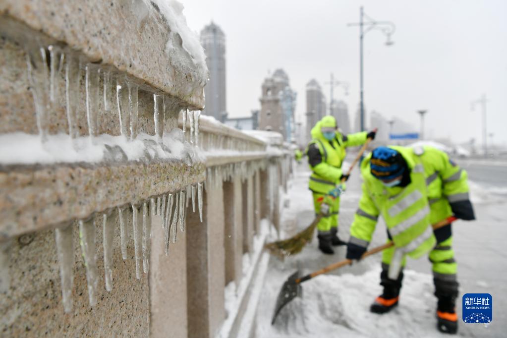 11月9日,环卫工人在哈尔滨一路段进行清雪作业。