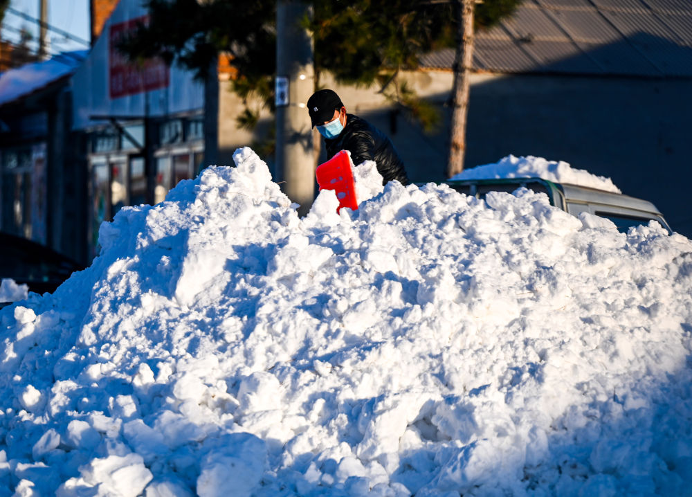 ↑11月10日,在内蒙古通辽市开鲁县,当地群众清理积雪。