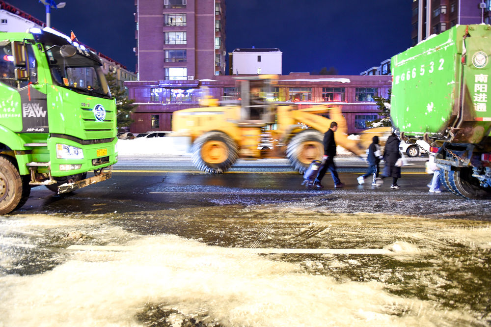 ↑11月10日,在内蒙古通辽市,作业车辆清理城区路面积雪。