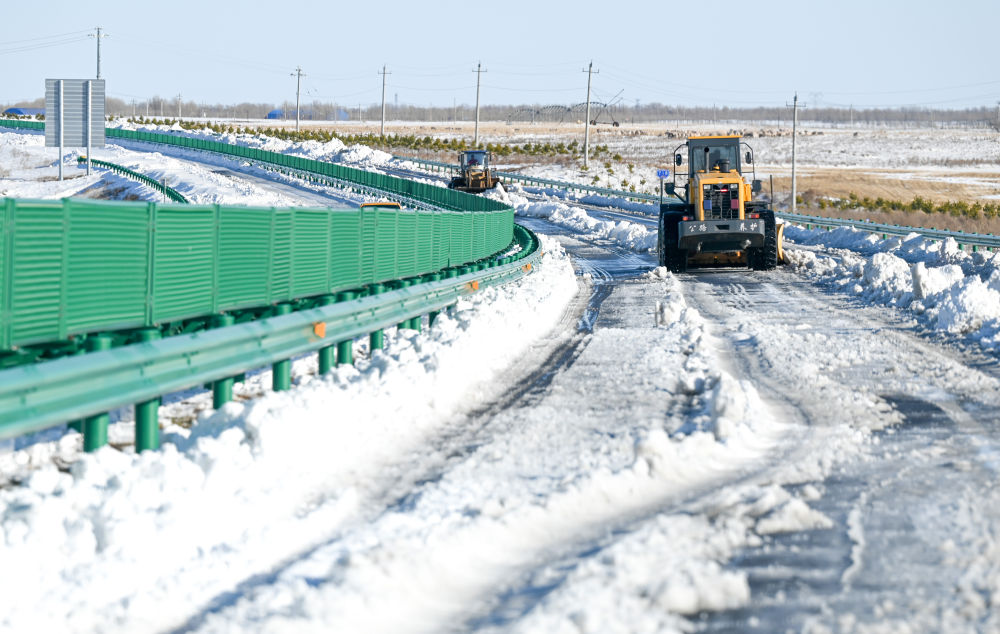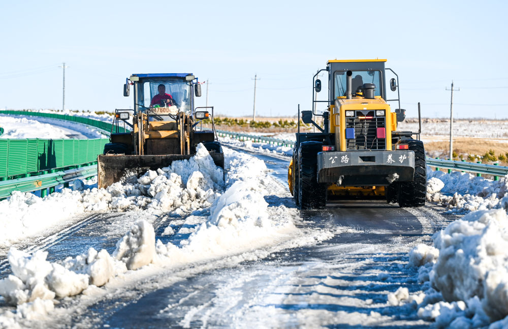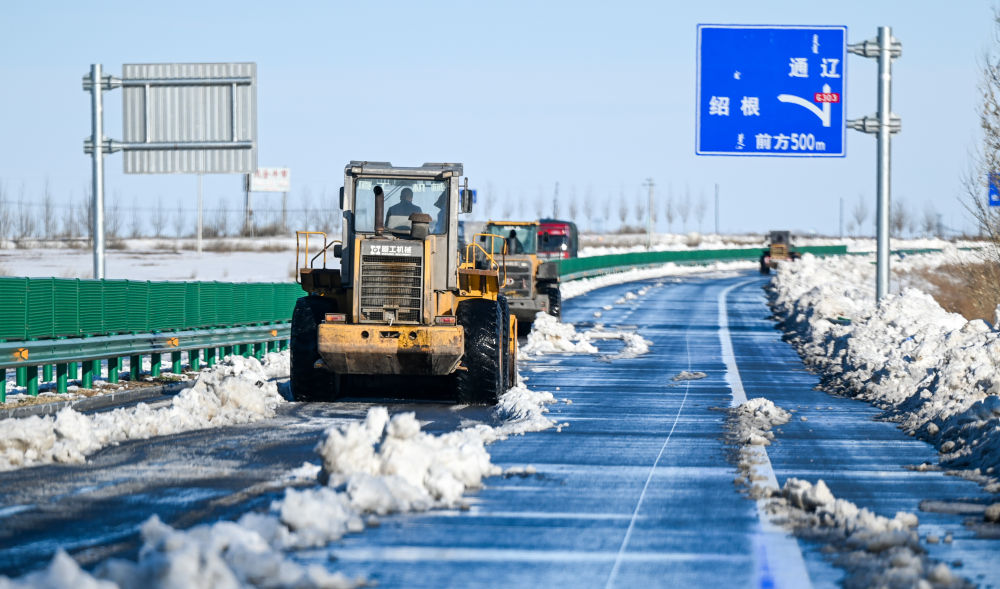 ↑11月10日,在内蒙古通辽市,作业车辆在路上清理积雪。