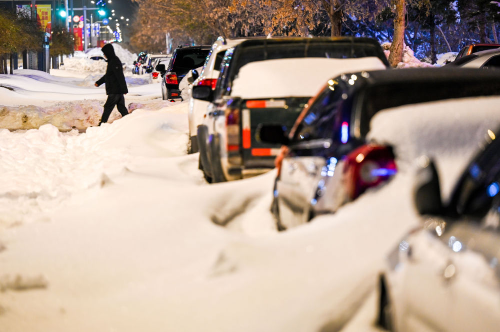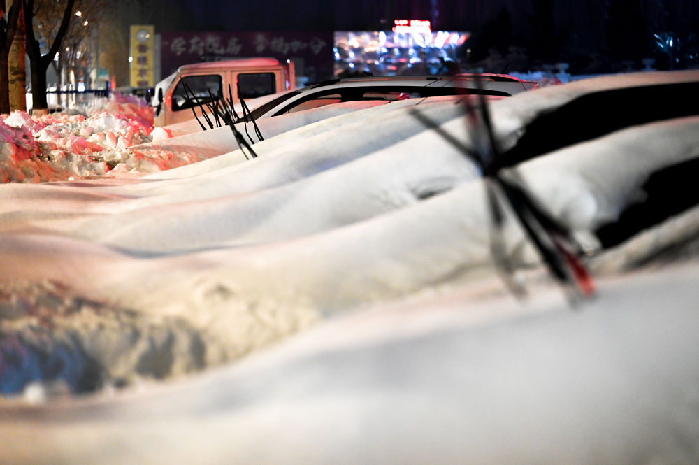 ↑11月10日,在内蒙古通辽市,汽车被积雪覆盖。