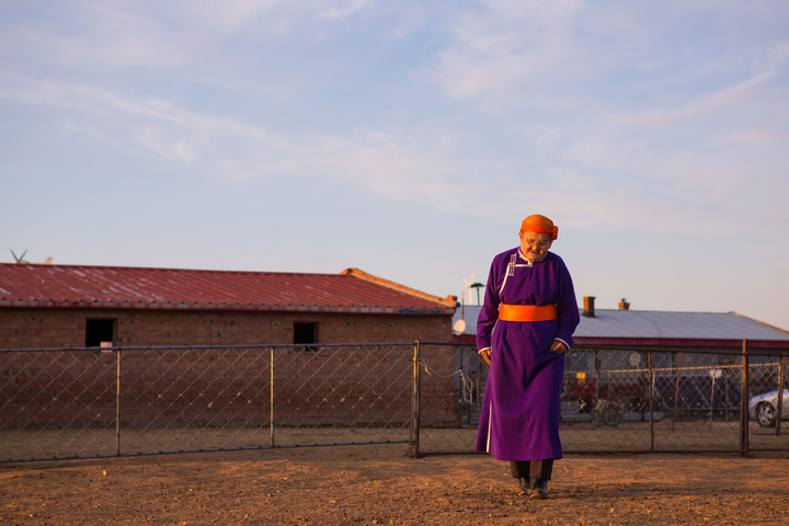 身穿紫色蒙古袍,头戴橘红色头巾,79岁的都贵玛坐在暖阳下,向记者缓缓讲起以前的故事。