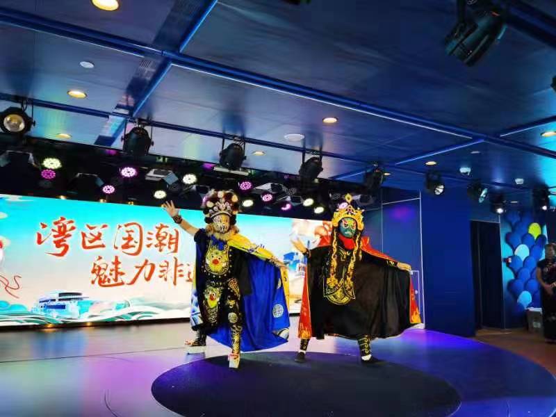 除了航线沿途独特的风光,微游轮上还有丰富多彩的文化娱乐节目。国粹京剧、非遗舞狮表演、悠扬粤剧、飞花令等湾区国潮主题活动让游客可以感受到中国传统文化的精华,甲板乐队和魔术等互动表演,让这条文旅航线一路欢声笑语。