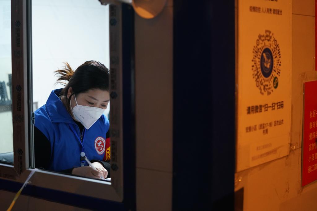 黑河市一名志愿者在社区卡口临时移动板房内梳理来往车辆和人员登记信息。新华社记者王松 摄