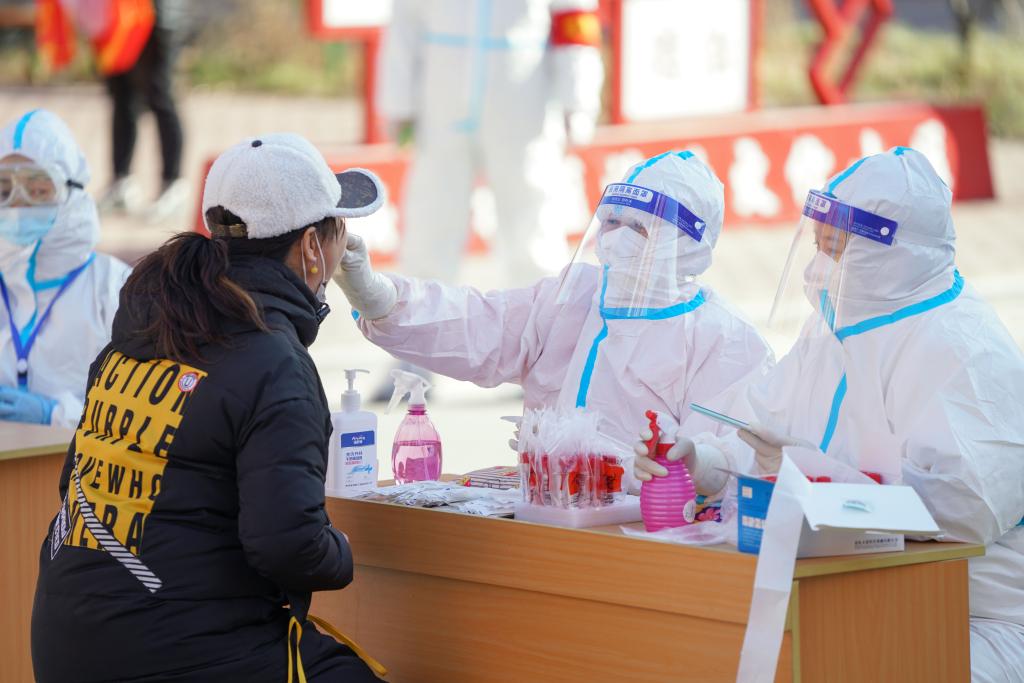 黑河市民在一处核酸检测点接受核酸采样。新华社记者王松 摄