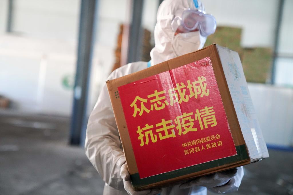 在黑河市一物资转运区,工作人员将生活物资装车后发往社区。新华社记者王松 摄