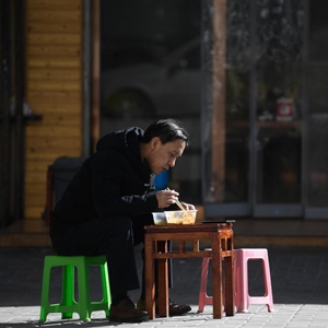 11月18日,一位市民在西宁市城西区一家餐馆外就餐。新华社记者 张龙 摄
