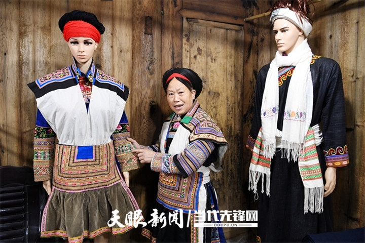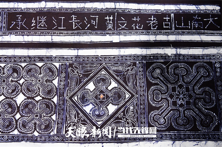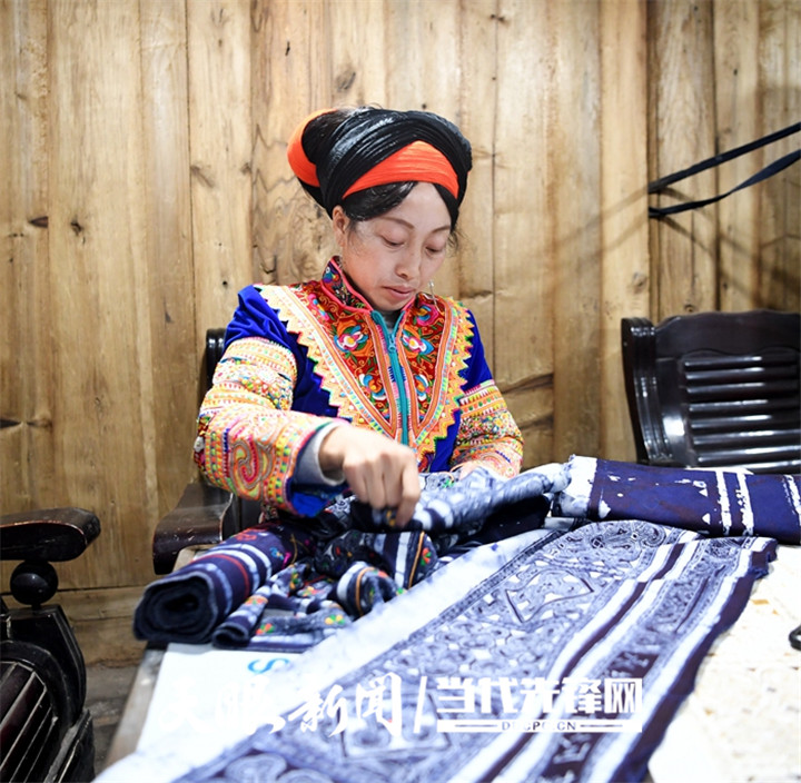 走进大南山苗寨一处古朴民居内,里面摆放着绣制好的苗族服饰和手工艺品。几位苗族女同胞有的在刺绣、有的在用蜡染绘制图案,有说有笑。她们用针和线在织好的布上绘制、绣出几何图案,不仅融入了历史文化,还包含民族特色的内容,让每一个图案都具有很深的文化内涵。