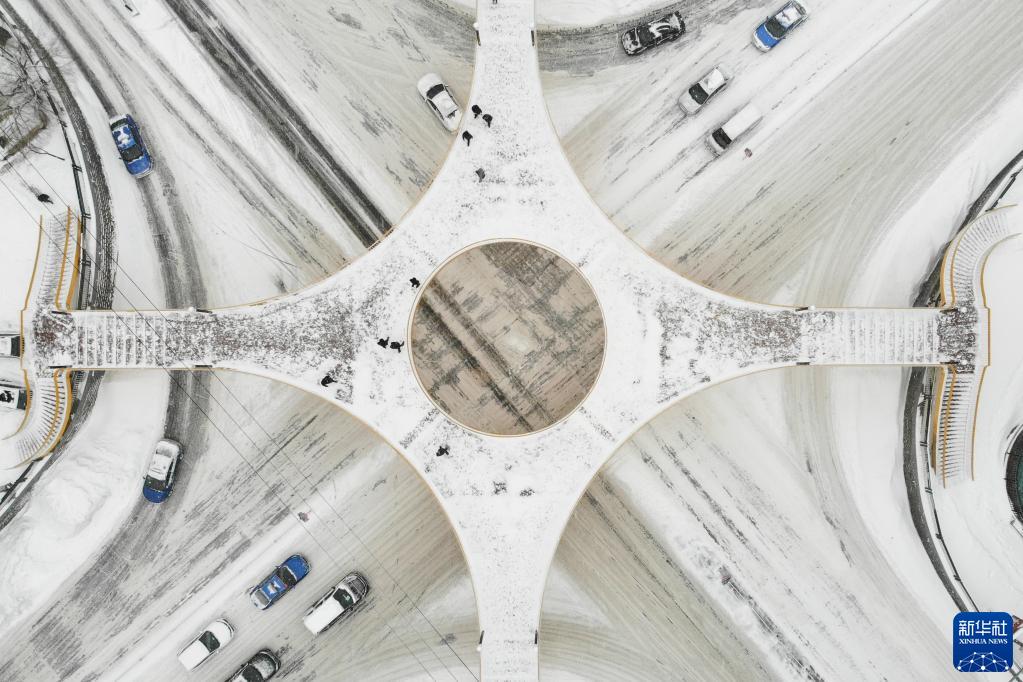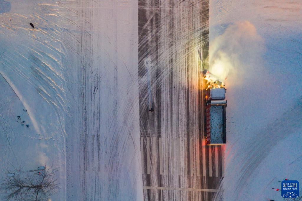 11月22日,在黑龙江省鹤岗市,清雪车在街道上作业(无人机照片)。新华社记者 谢剑飞 摄