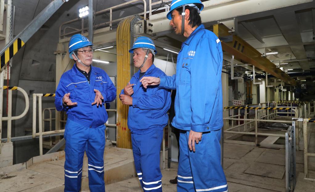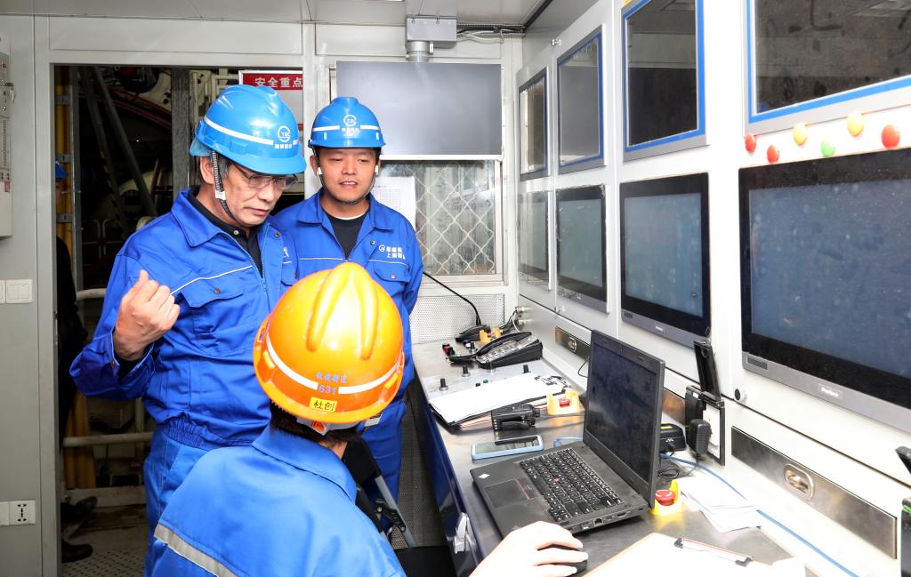 李鸿在地下盾构操控室内与操作工人交流。新华社记者 方喆 摄