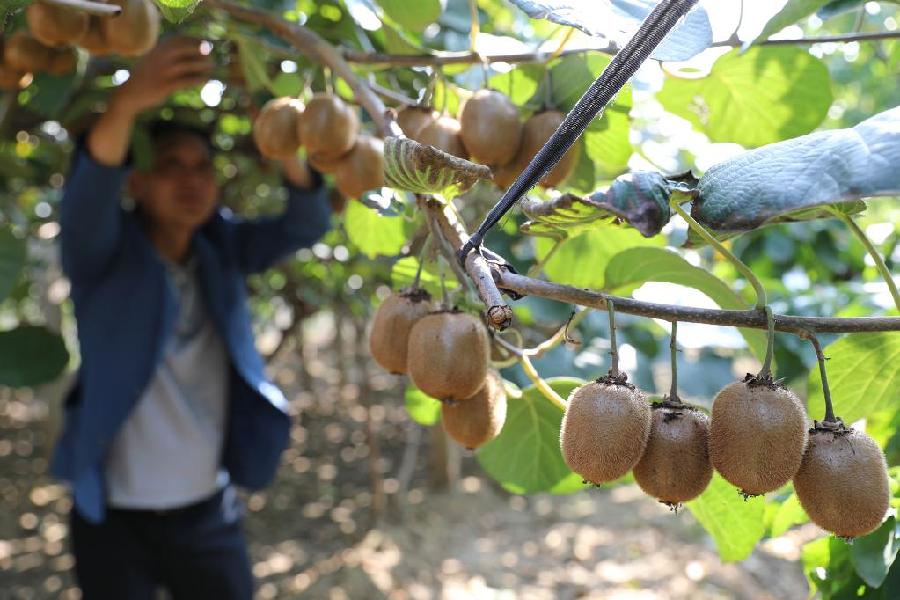 在眉县齐镇斜峪关村一处猕猴桃园,村民在采摘猕猴桃。(新华社记者都红刚摄于2019年9月29日)