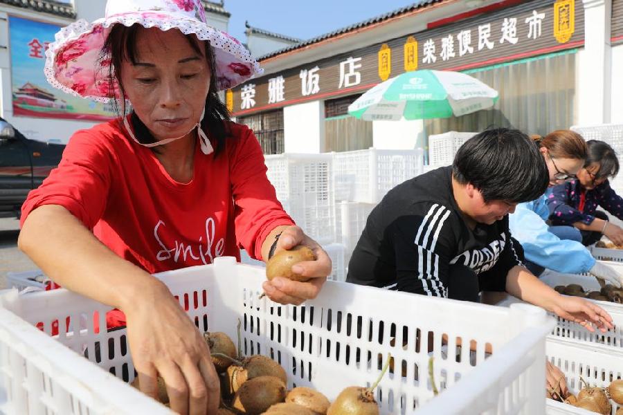 在眉县齐镇斜峪关村的水果批发市场,村民在分拣猕猴桃,准备装箱。(新华社记者都红刚摄于2019年9月29日)