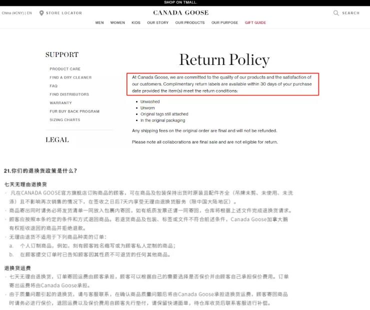 加拿大鹅表示,专门店售出的每一件产品在交付前均由受过专业训练的销售人员进行质量检查,并需由顾客现场确认。产品在交付后,若出现质量问题,符合加拿大鹅保修政策的,可以享有终身材料和工艺保修服务。