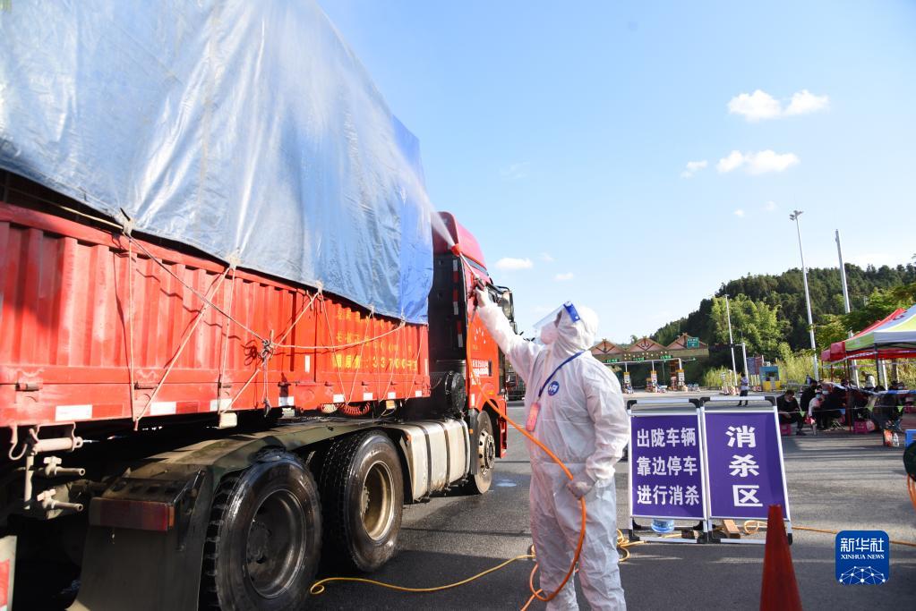 12月4日,在瑞(丽)陇(川)高速公路章凤收费站路口,工作人员对货车进行消杀。新华社记者 浦超 摄