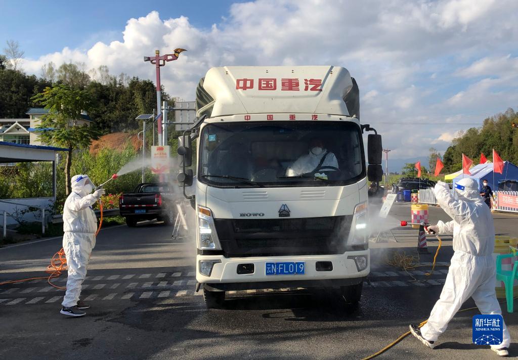 12月4日,在瑞(丽)陇(川)高速公路章凤收费站路口,工作人员对货车进行消杀。新华社记者 林碧锋 摄