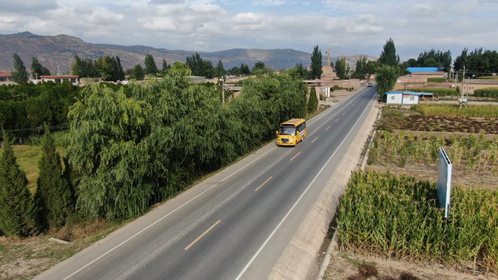 渭州学校的校车行驶在田野之间。新华社记者郎兵兵 摄