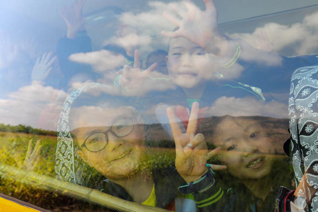 校车上的学生们开心地向窗外打招呼。新华社记者王紫轩 摄