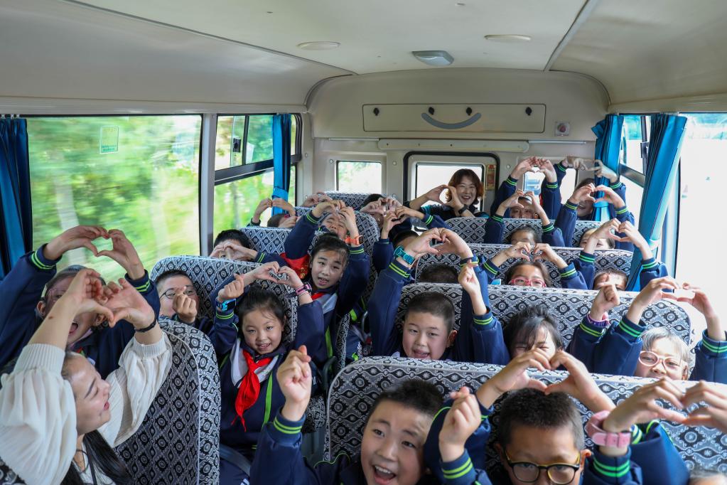渭州学校的学生和老师在校车上一起“比心”。新华社记者王紫轩 摄