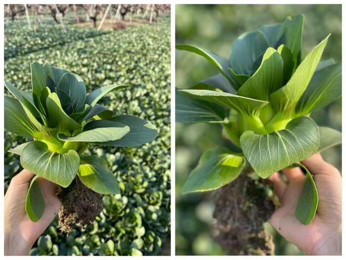 桃园插种是新场特色。在合作社的桃园内,“矮脚青”在老桃树下簇拥而生,抱团取暖。深秋寒冬,万物凋敝,怕冷的虫子没了踪影,一颗颗青菜圆润壮实、翠色欲滴。