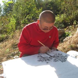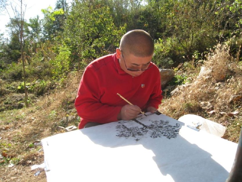 何深在自制的定兴书画毡上写生。(受访者供图)