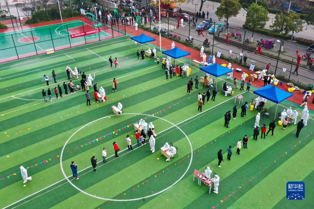 12月8日,在浙江省宁波市镇海区中官路体育公园核酸检测点,人们排队接受核酸采样(无人机照片)。新华社发(胡学军摄)