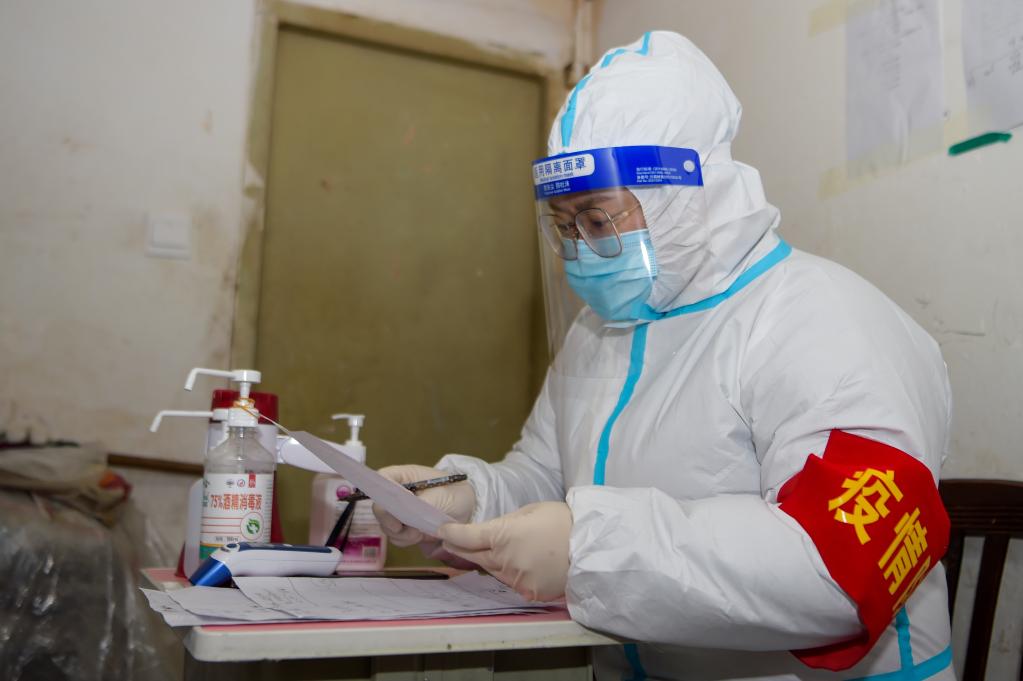 12月7日,在满洲里市现代花园小区,志愿者王力丰在核对居民信息。新华社记者李志鹏 摄