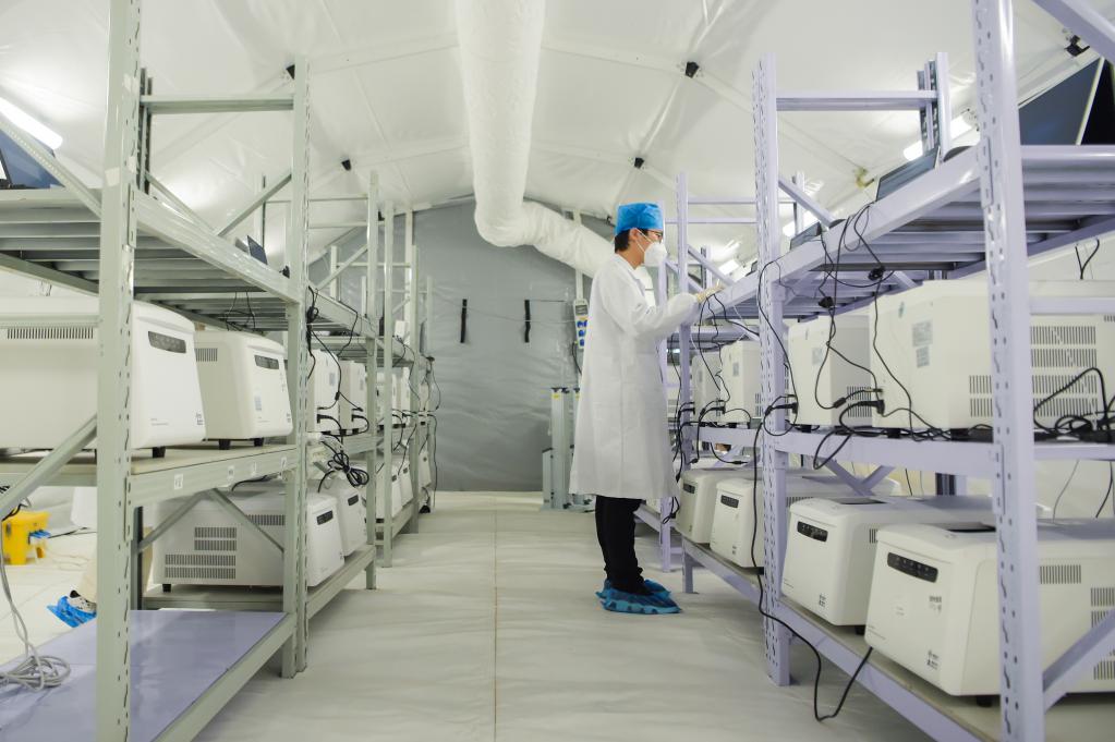 12月3日,工作人员在“猎鹰号”硬气膜实验室进行核酸检测。新华社记者达日罕 摄