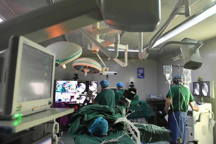 拉萨市人民医院骨科医生在北京积水潭医院专家远程指导下使用骨科机器人开展骨科手术(2021年4月19日摄)。新华社记者 孙瑞博 摄