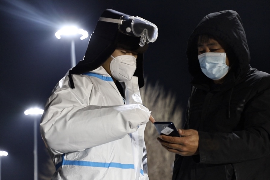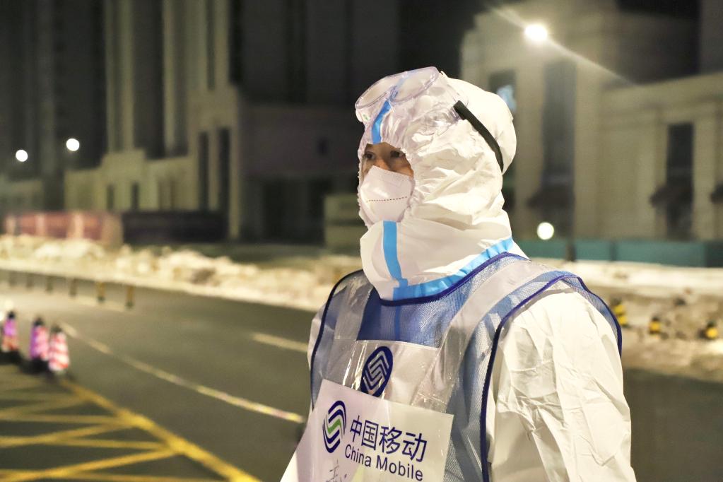 在哈尔滨市新松茂樾山小区,中国移动哈尔滨分公司网络部工程师赵伟穿着防护服,手持安装了专业软件的手机,在小区里测试紧急建成的微基站。他在小区里走来走去,护目镜里形成一层白霜。