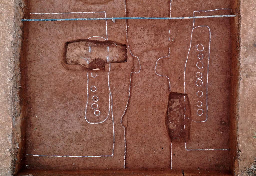 记者在门址发掘现场看到,门道两侧的夯土柱槽和成排柱洞清晰可见。南侧柱槽内有柱洞8个,北侧柱槽内的部分柱洞被近代墓打破,残存5个。“古人建造城门,会在门道两侧挖出密集排列的柱洞,每个柱洞底部垫有石块加以支撑,再立上柱子撑起门道的高度。”陈国梁说,偃师商城军事色彩浓郁,该城门为单门道,门道宽度约3.2米,当时设计这么窄可能是为了防御外侵。