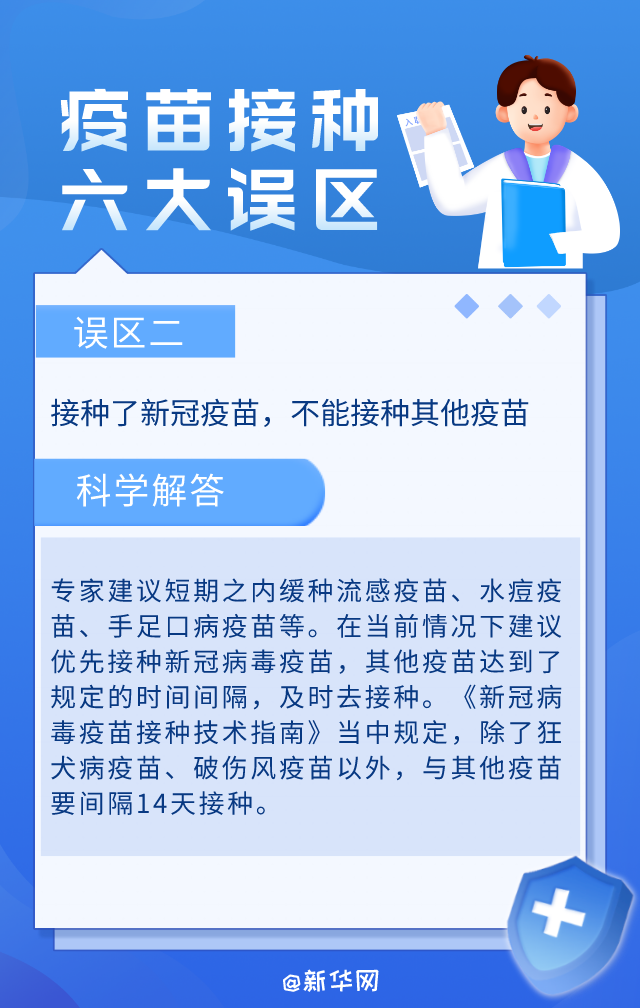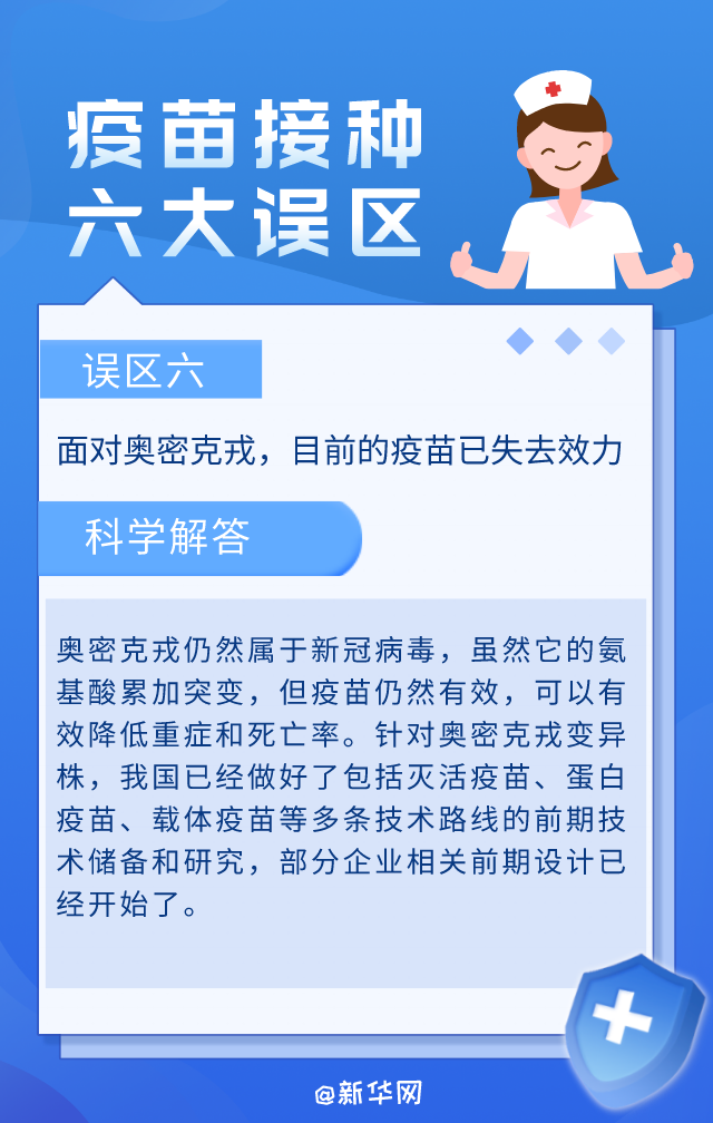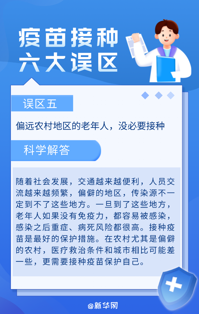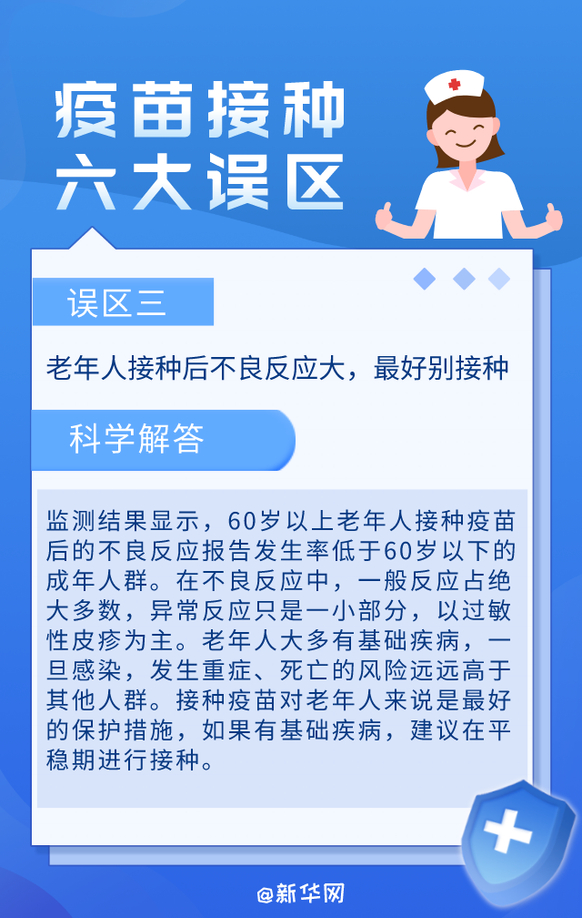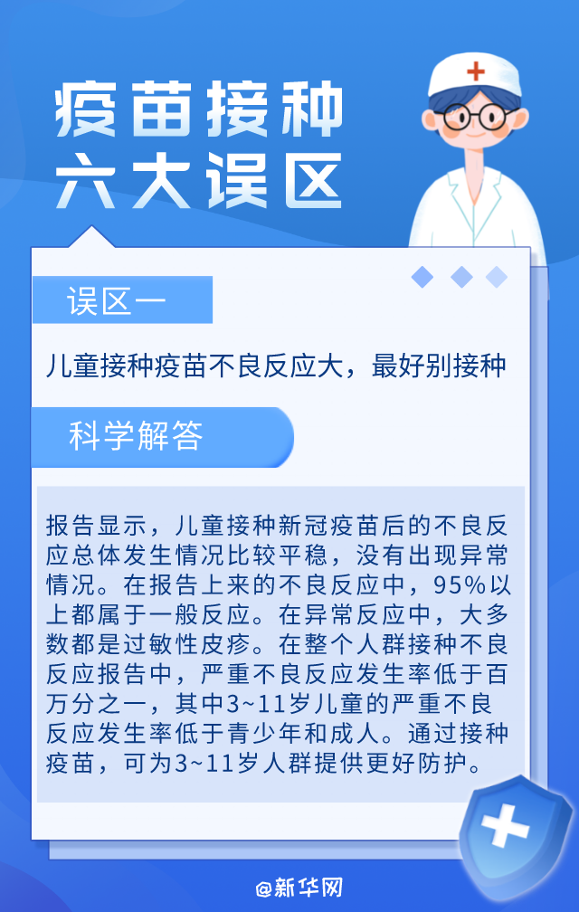 当前,我国各地正在推进新冠病毒疫苗的接种工作。在疫苗接种过程中,尤其在老年人和3~11岁儿童的疫苗接种过程中,有一些认识误区影响人们的正常接种。科学了解新冠疫苗接种,这六个误区要避免。