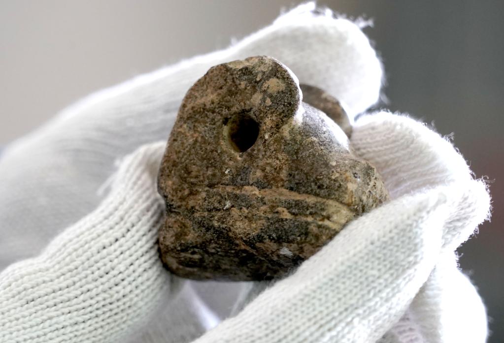 这是苏羊遗址出土的外形似虎头的兽首石雕(12月15日摄)。新华社记者 李安 摄