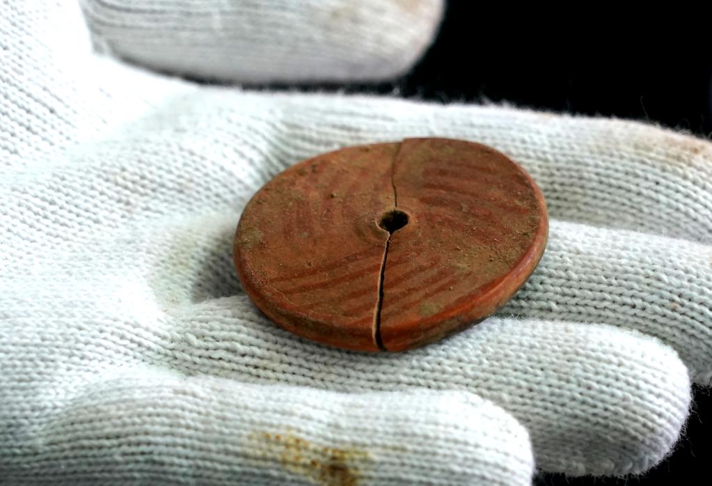 这是苏羊遗址出土的彩陶纺轮(12月15日摄)。新华社记者 李安 摄