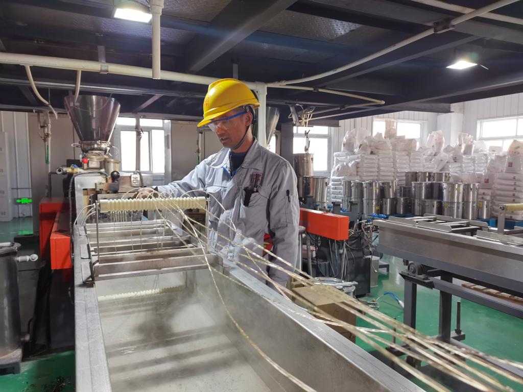 安徽摩纳珀里科技有限公司工作人员正在造粒车间生产。新华社记者 水金辰 摄