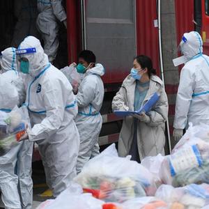 12月21日上午,上虞区曹娥街道金桂苑社区党总支书记、居委会主任祝祖英(右三)正在协调分配居民生活物资。 新华社记者 翁忻旸 摄