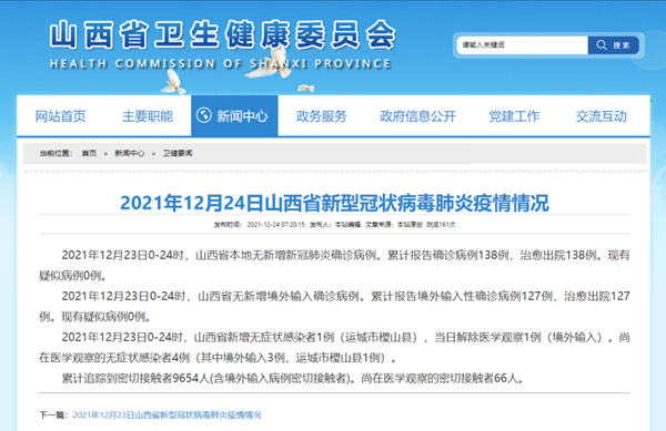 2021年12月23日0-24时,山西省新增无症状感染者1例(运城市稷山县),当日解除医学观察1例(境外输入)。尚在医学观察的无症状感染者4例(其中境外输入3例,运城市稷山县1例)。