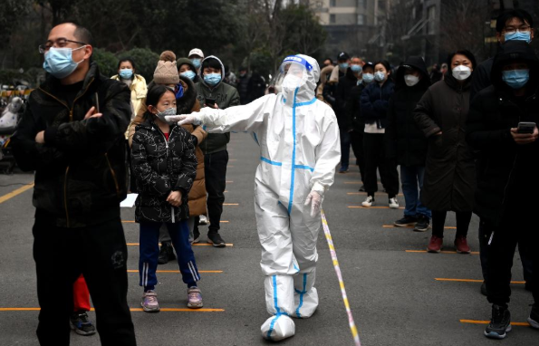 12月23日,西安市新城区碧翠锦华社区内,核酸检测人员在维持秩序。新华社记者刘潇摄