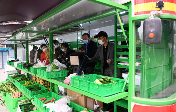 12月23日,西安市曲江新区曲池坊小区内引入蔬菜大棚车,供住户在小区内买菜。新华社记者刘潇摄