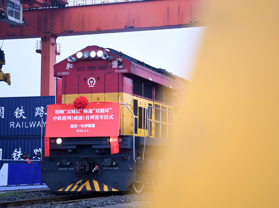 2021年1月1日,中欧班列(成渝)号首列班车在重庆团结村站等待发车。新华社记者唐奕 摄