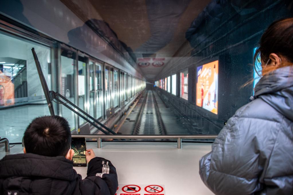 12月26日,乘客体验全自动驾驶的武汉轨道交通5号线,在首节车厢拍照。新华社发(伍志尊摄)