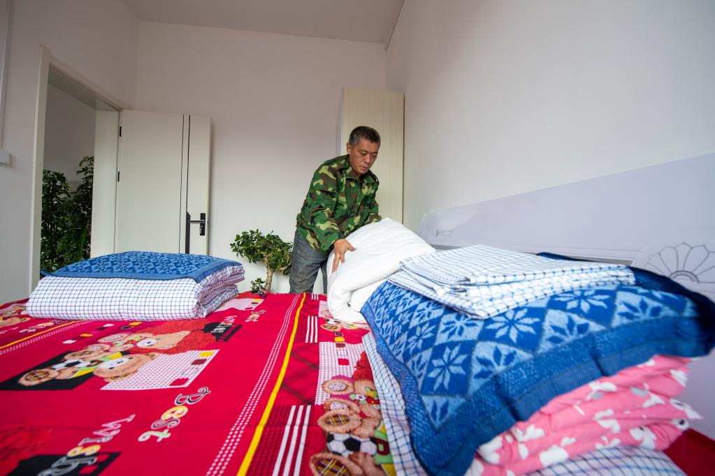 山西省临汾市安泽县石渠村村民李玉星在新房整理床铺。2021年12月31日新华社记者杨晨光 摄
