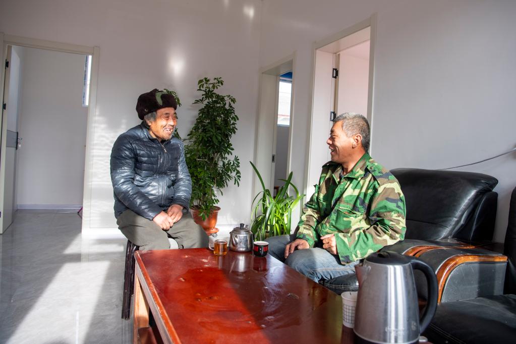 山西省临汾市安泽县石渠村村民陈小根(左)在村民李玉星(右)的新房内聊天。2021年12月31日新华社记者杨晨光 摄