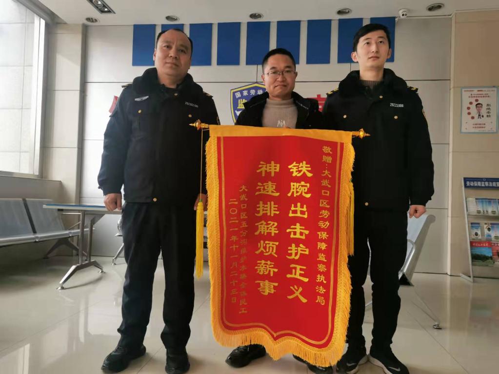 快到晌午时分,45岁的重庆农民工朱继建步履匆匆来到宁夏回族自治区石嘴山市大武口区劳动保障监察执法局,手里还捧着一面锦旗,锦旗上写着:“铁腕出击护正义,神速排解烦薪事”。