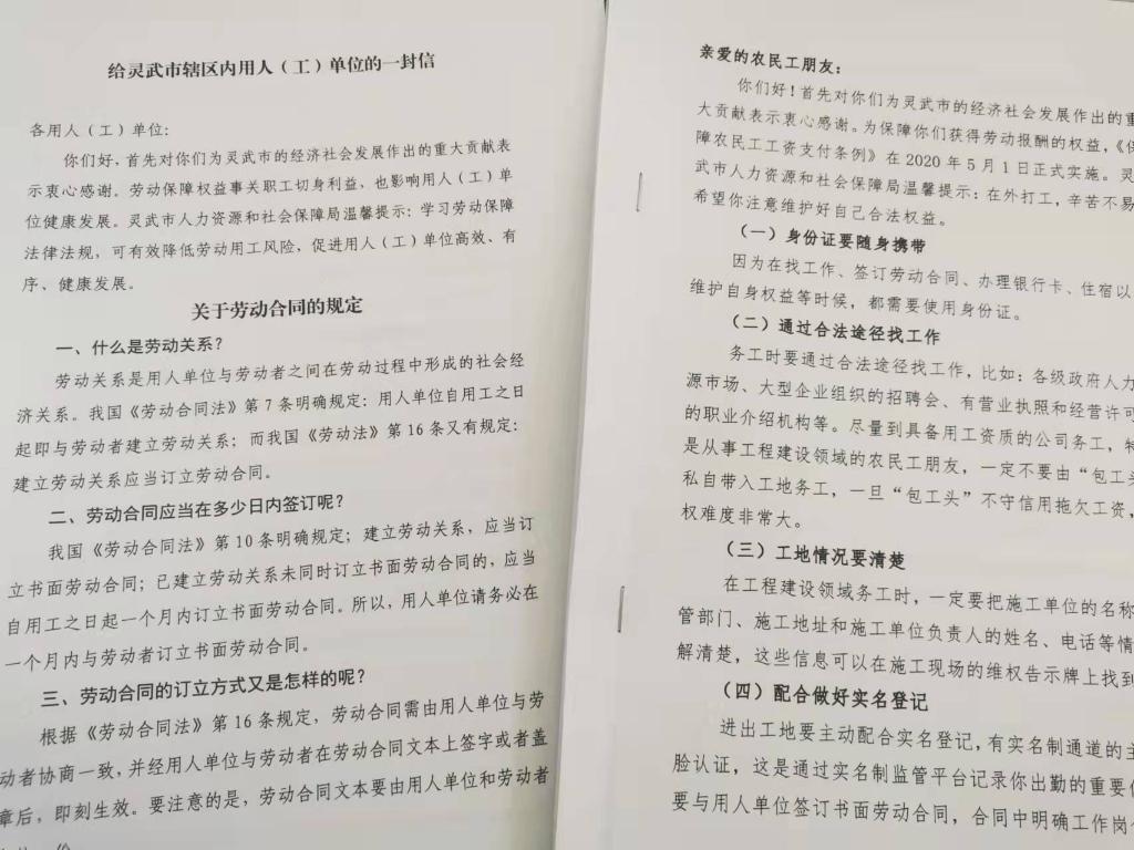 针对农民工群体法律意识薄弱,维权举证“口说无凭”的问题,最近灵武市劳动保障监察执法局还特意用“大白话”给他们写了一封信,从进工地、实名制、发工资、留证据、打官司等环节,“手把手”教农民工依法理性获取劳动报酬,要薪酬不愁心。