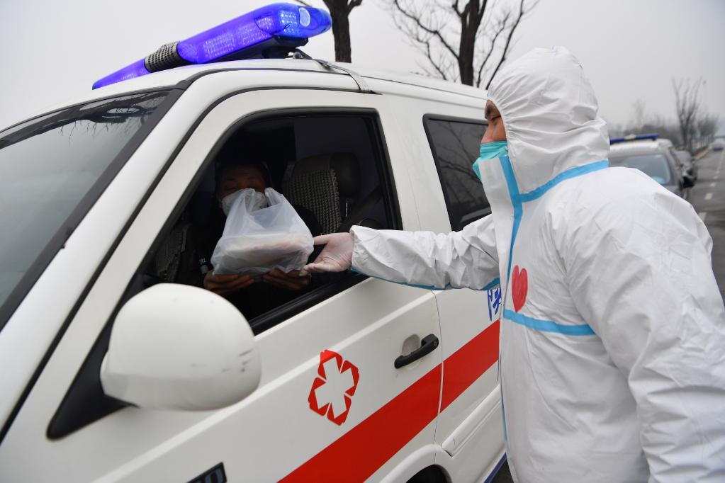 1月4日,在西安市雁塔区,志愿者畅璘将食品送至一位负责运输核酸检测样本的救护车驾驶员手中。新华社记者 张博文 摄