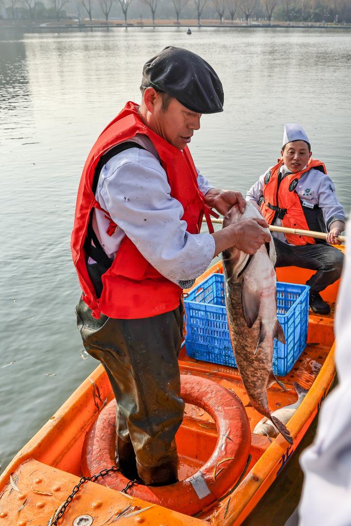 图为上海对外经贸大学在学校人工湖中进行新年捕鱼。施晖摄