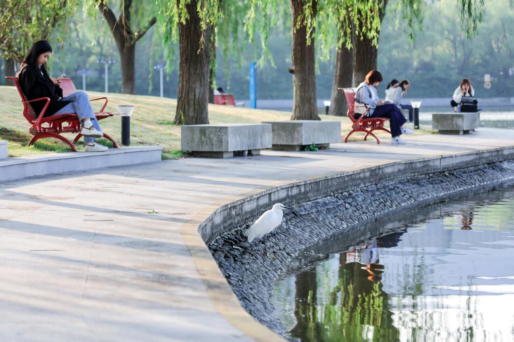 “十多年前,白鹭还属稀客,拍摄要靠运气。这几年,白鹭及其他鹭鸟则将思源湖及其周边湿地当作了家,鸟类捕鱼和学生晨读,成了思源湖一景。”施晖说。
