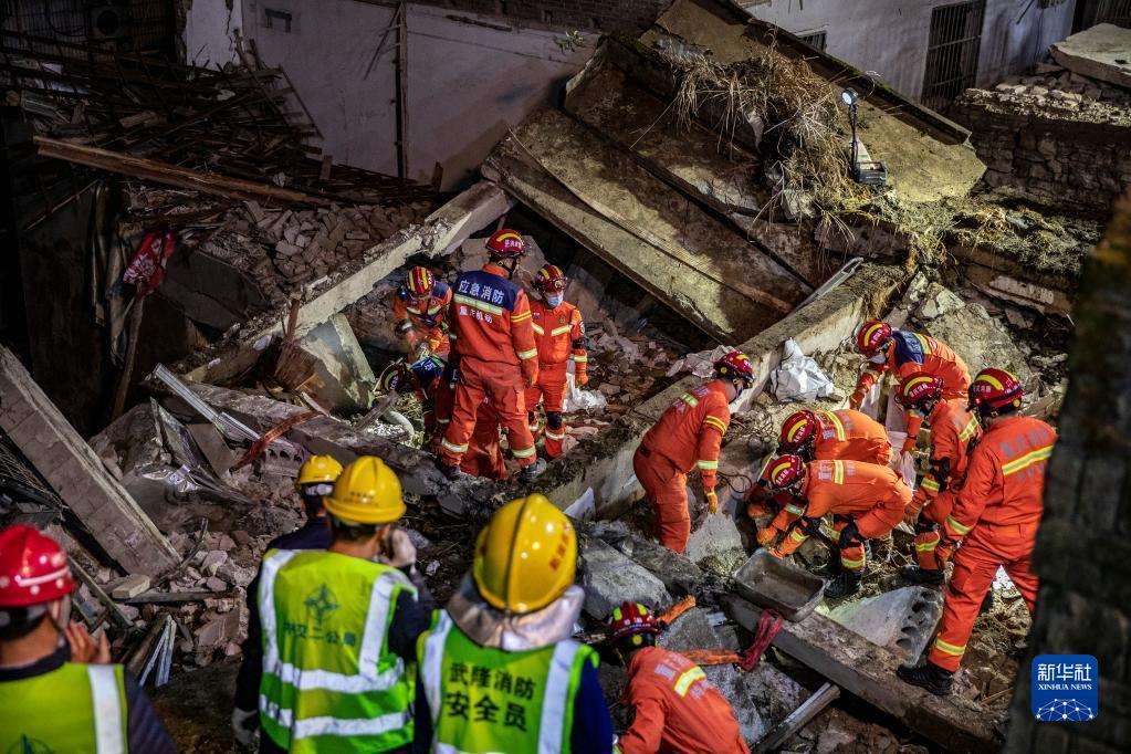 记者在现场看到,消防救援人员出动多只搜救犬,在坍塌楼板的缝隙间搜寻被困人员,陆续有被困人员被救出。