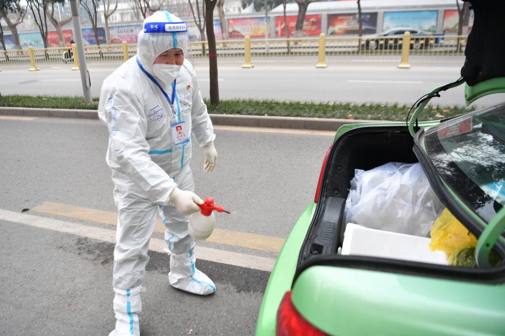 1月5日,西安“的哥”王锋利在出发转运核酸检测样本前为车辆消毒。新华社记者 张博文 摄